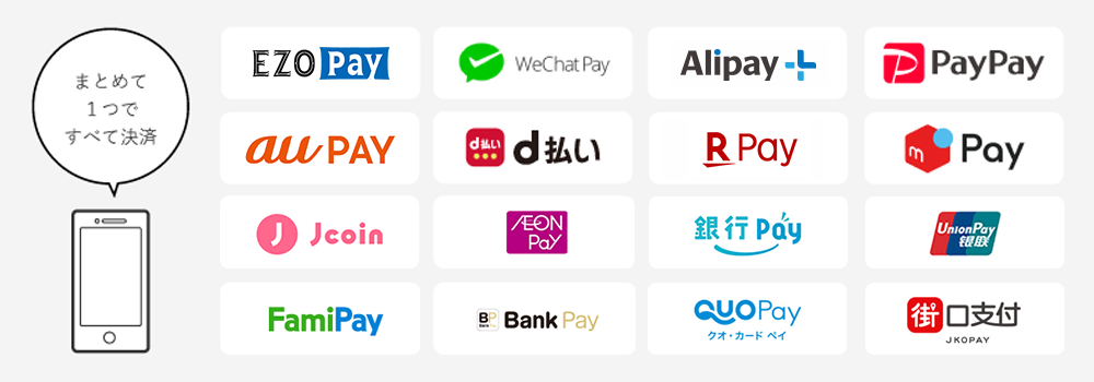 当社のサービスでは、国内外30種類以上のQRコード決済を、アプリ1つ端末1つでまとめて導入することができます。またすべての決済ブランドのオフィシャルパートナーであるため、単なる決済⼿段としてでなく、各ブランドを利⽤したプロモーションや販促もサポートいたします。